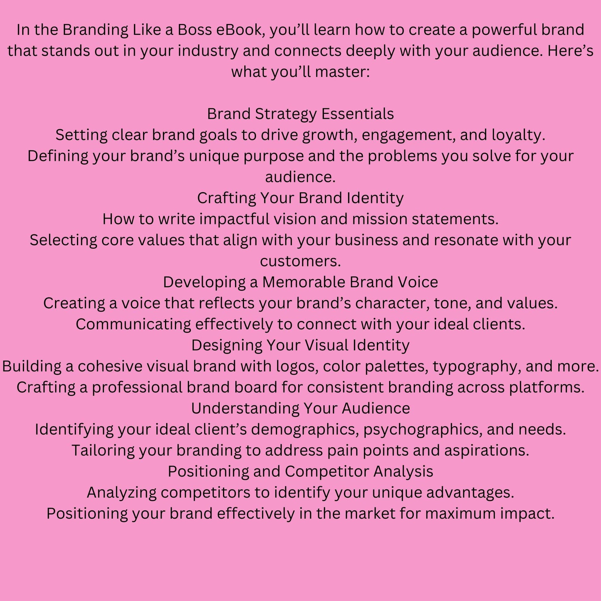 Branding Like a Boss is your ultimate guide to building a bold and unforgettable brand. This eBook walks you through creating a strong brand strategy, defining your mission and vision, and crafting a visual identity that resonates with your audience. Packed with actionable tips, templates, and guidance, it’s perfect for entrepreneurs, creators, and business owners looking to stand out, attract their ideal clients, and grow their brand with confidence. Elevate your branding game today!