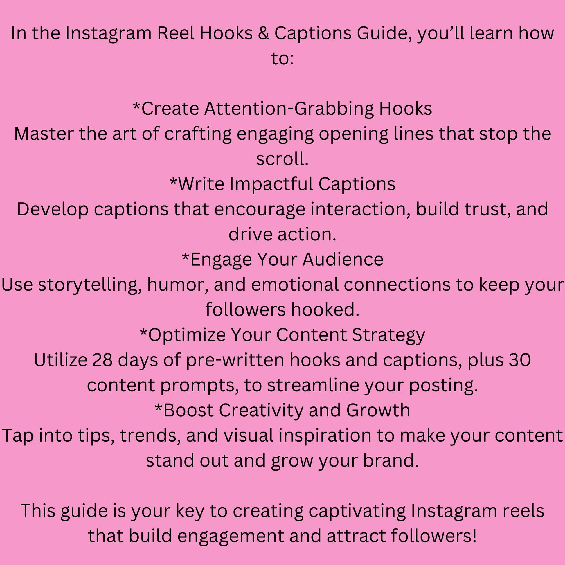 The Instagram Reel Hooks & Captions Guide is your go-to resource for creating scroll-stopping content that captivates and converts! Packed with 28 days of pre-written hooks and captions, plus 30 bonus content prompts, this guide helps you effortlessly craft engaging reels that grow your audience and boost your brand. Whether you're a content creator, entrepreneur, or marketer, this guide provides practical tips and actionable strategies to make your Instagram content stand out. Take your social media game to the next level today!