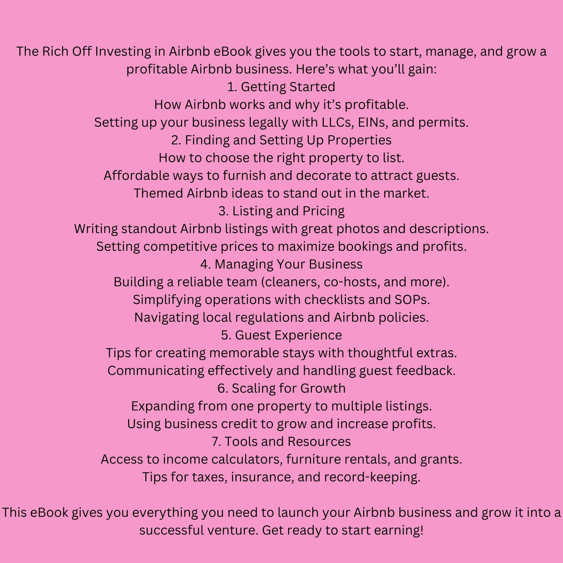 Rich Off Investing in Airbnb is the ultimate step-by-step guide to starting and scaling a profitable Airbnb business. Perfect for beginners, this eBook covers everything from setting up your business legally to finding the right properties, creating standout listings, and delivering exceptional guest experiences. Packed with actionable tips, pricing strategies, and growth techniques, it’s designed to help you build a successful short-term rental business and unlock consistent passive income. Whether you’re starting with one property or planning an empire, this guide has you covered!